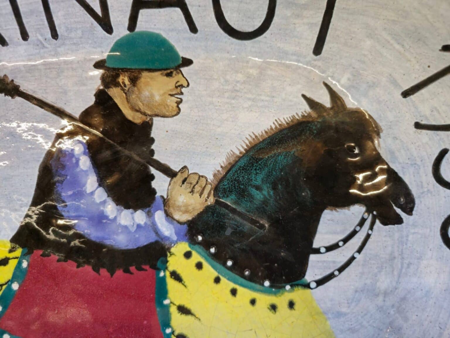 It was with this in mind that, in 1958, he produced a piece that was both striking and rare in terms of its subject matter: a dish illustrating a scene from the Ducasse de Mons or "Ducasse of Mons". Doudou. More specifically, the drawing depicts a Chinchin, an ally of Saint George in his fight against the dragon. He is carrying the bladders stolen from the little Lumeçons.