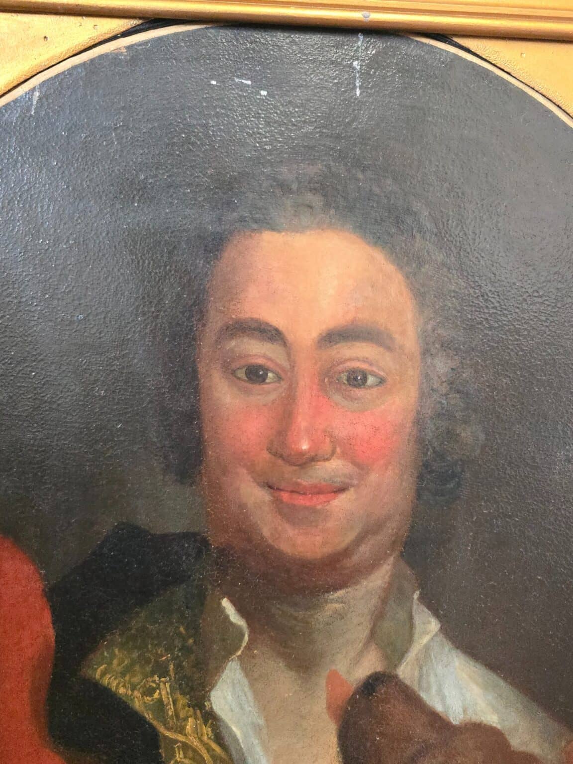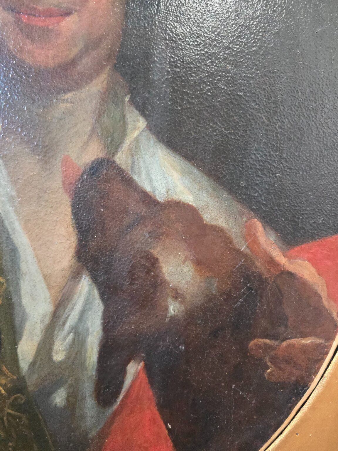 École anglaise (?), portrait d'homme au chien, huile sur toile, 18e siècle, 60 x 73 cm , avec cadre : 68 x 84 cm