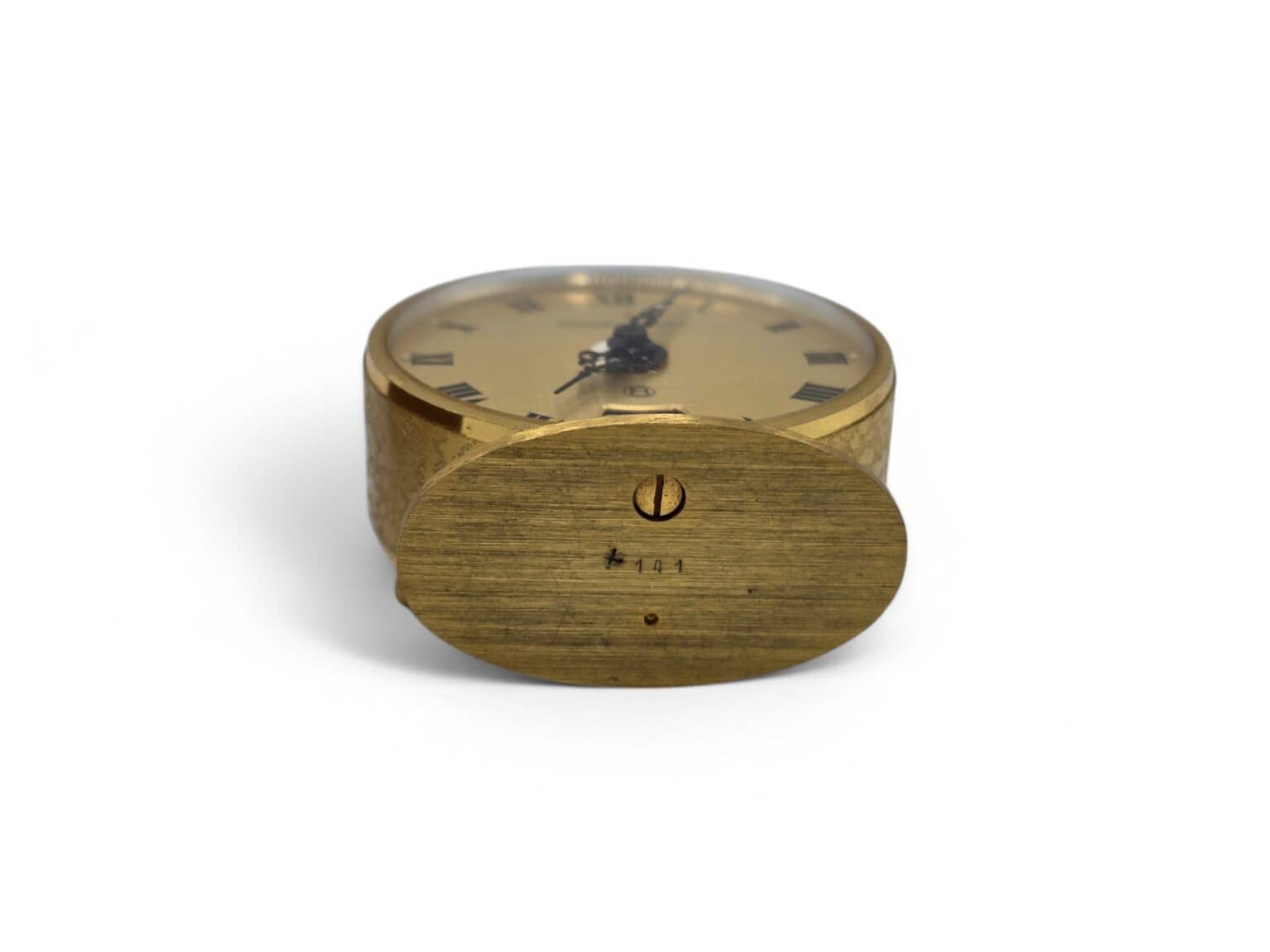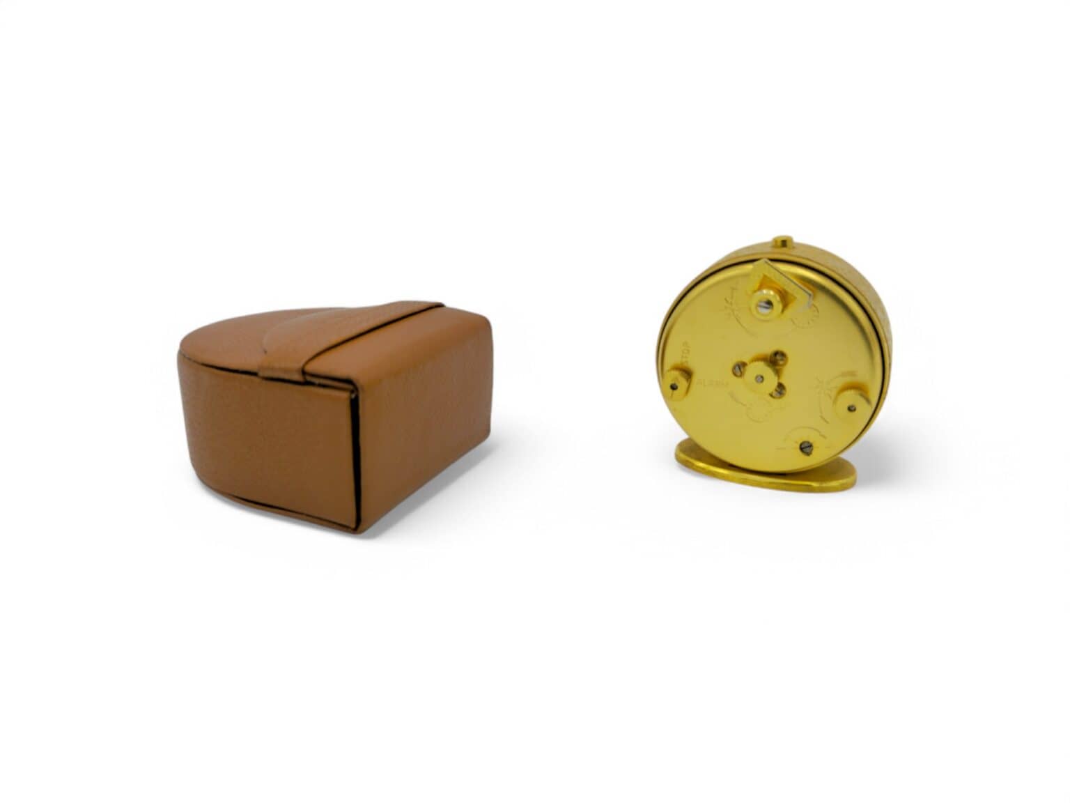 Jaeger-Lecoultre, pendulette réveil de voyage, référence 141 , mouvement à 8 jours, à cadran rond, aiguilles de style Louis XV et chiffres romains. Avec son étui en cuir brun clair, métal doré, 20e siècle, 4,5 x 5 x 2,5 cm