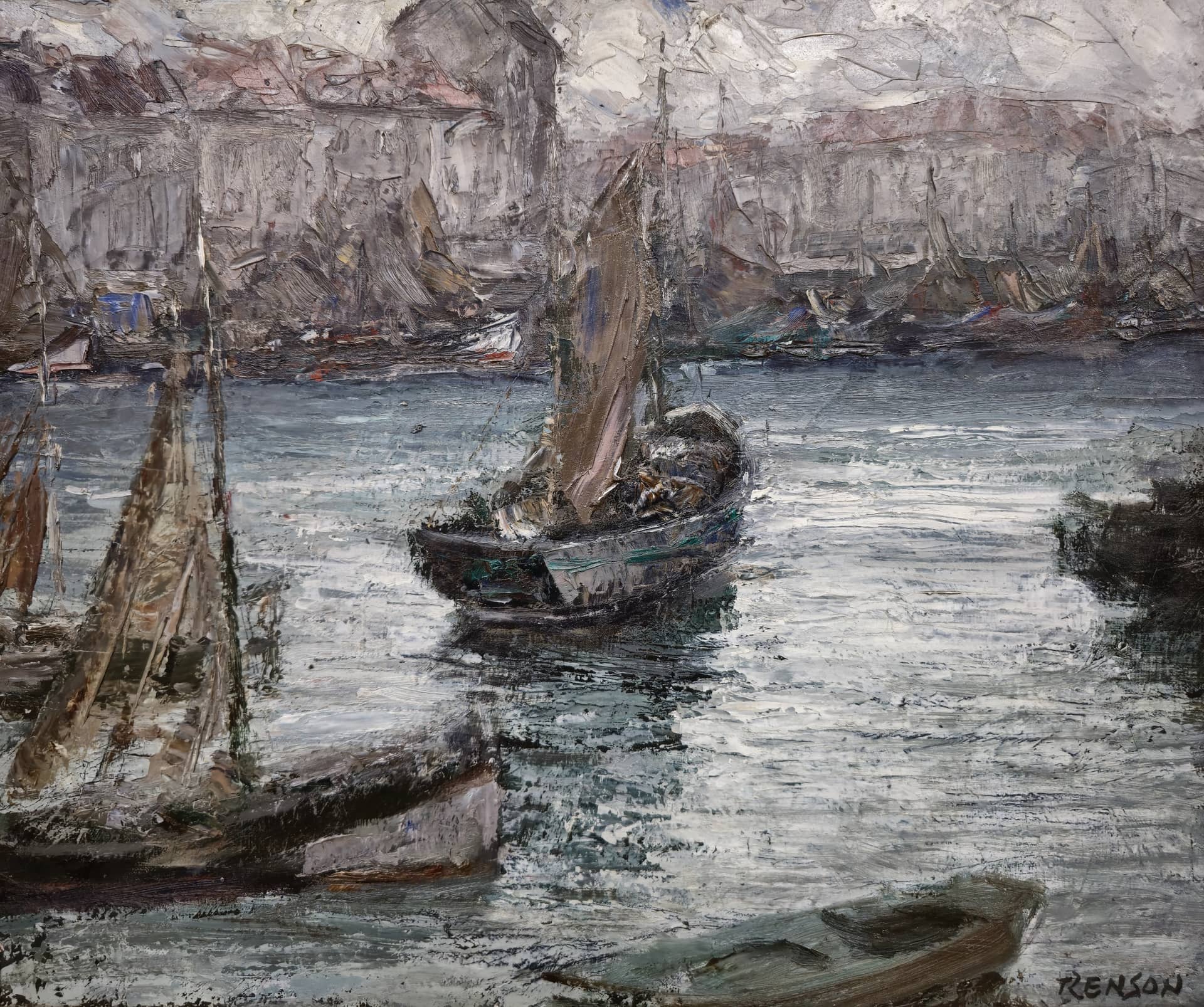 Toussaint Renson, 1898-1986, Bateaux amarrés, olieverf op doek, 20e eeuw, 60 x51 cm, 72 x 62 cm, gesigneerd rechtsonder.