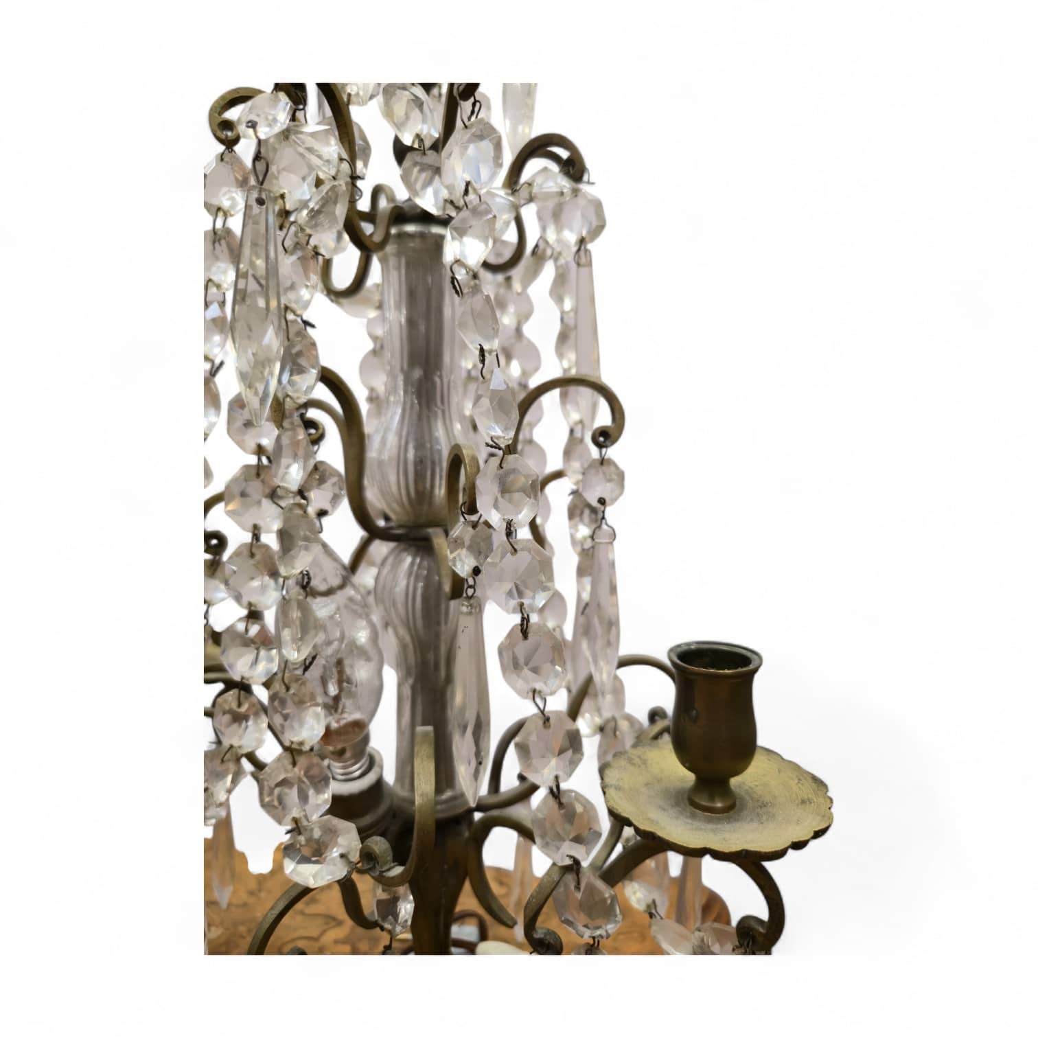 Paire de girandoles à deux bras de lumière, décor de volutes, fût central cannelé en verre moulé, bronze, pampilles de cristal taillé, de style Louis XVI, fin 19e-début 20e siècle, 51 x 30 cm