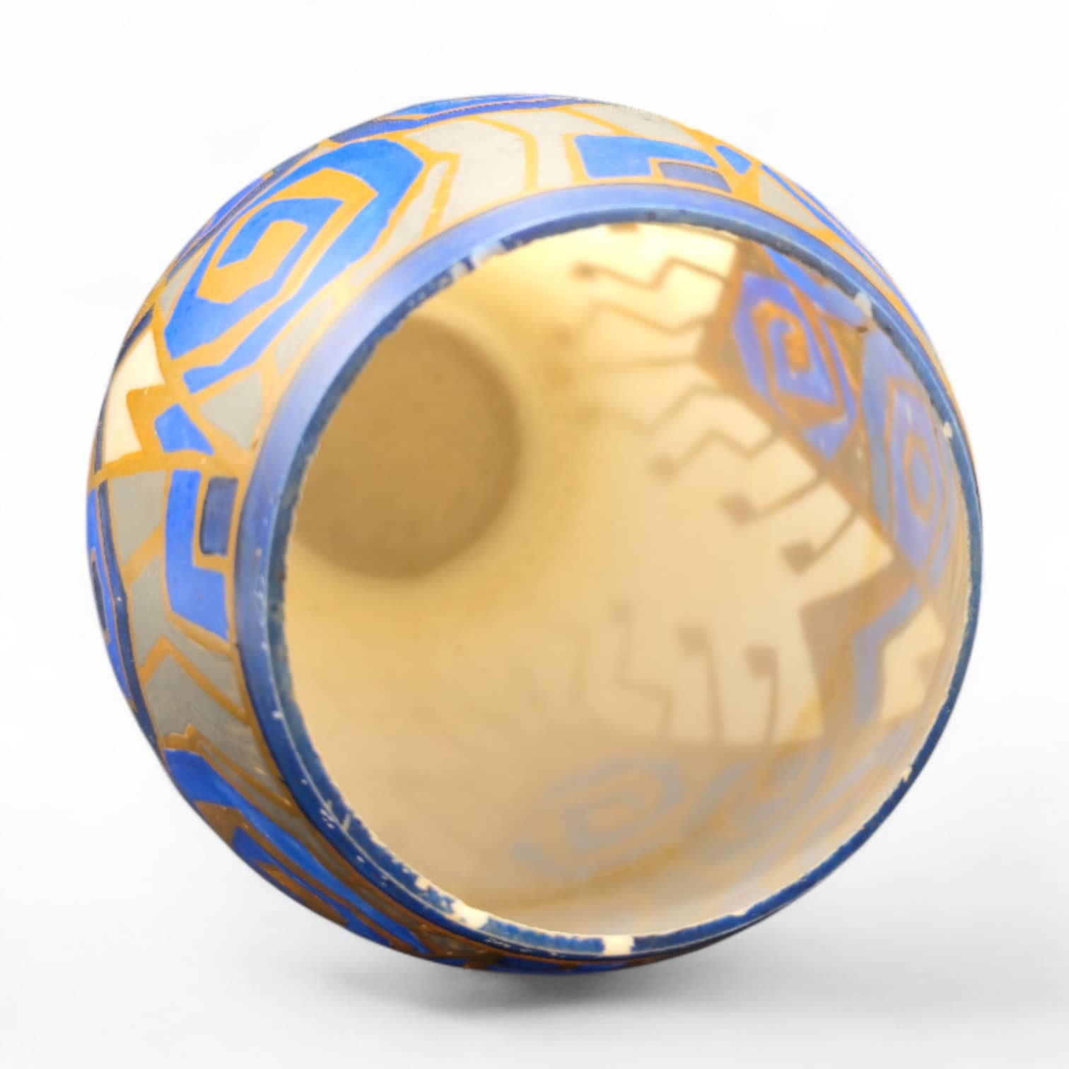 Entourage de Paul Bernard/Gobena, vase à décor géométrique polychrome, opaline émaillée, 20e siècle, période Art déco vers 1930, Marquage manuscrit sous la base D 11 SCAI (?) numéro d'inventaire au crayon : 2850 qui peut laisser suggérer un vase prototype, 28,5 cm