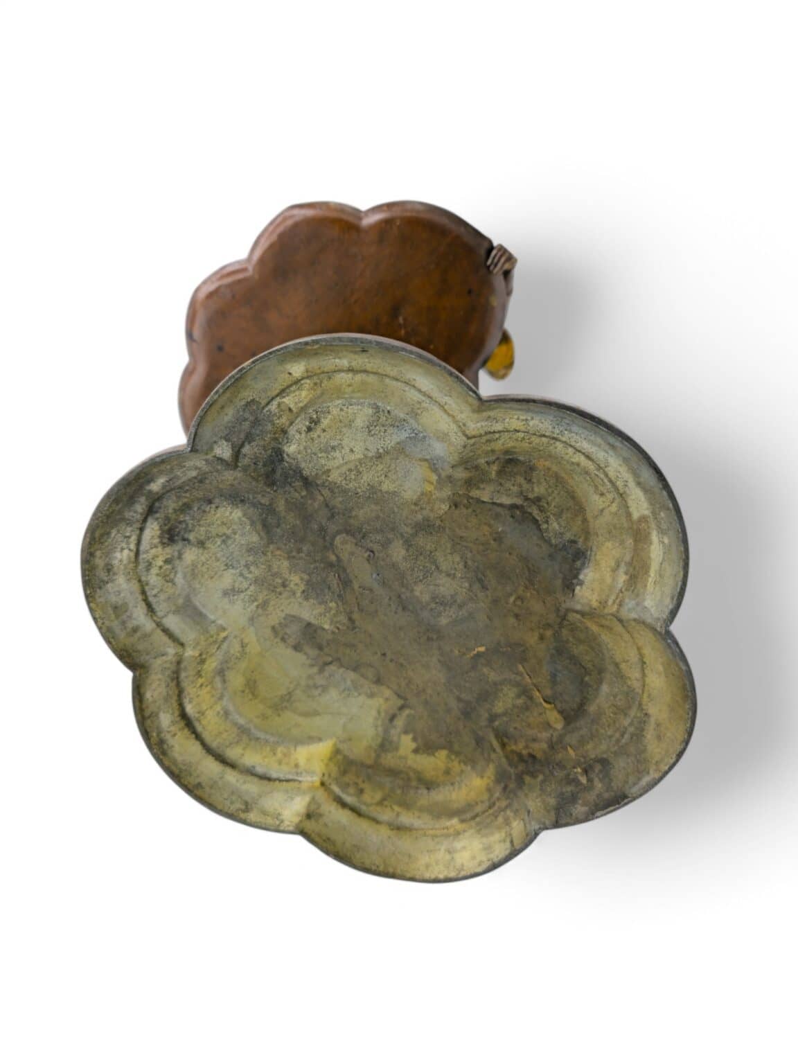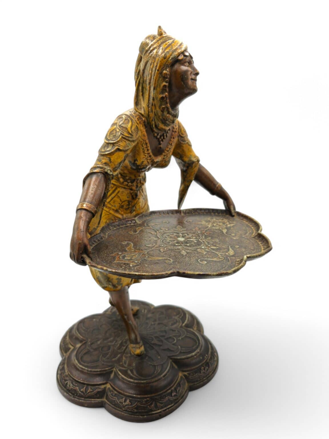 Anonyme, Femme orientale, servante, portant un plateau. Base et plateau polylobés, régule peint, polychromé, 19e siècle, 38,5 x 23 cm