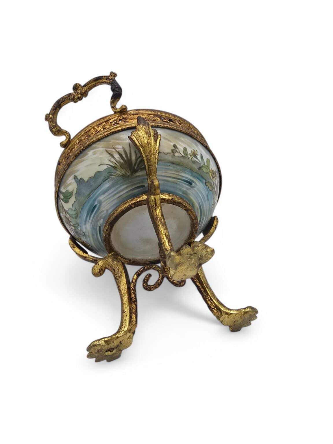 MAX - Snoepschaal gedecoreerd met een liggende vrouw met een lier in een landschap, beschilderd porselein en brons, 20e eeuw, 15 x 15 cm - merk AP