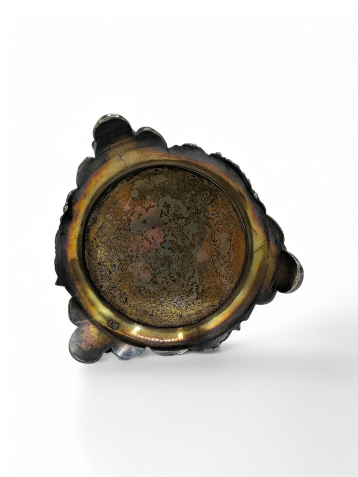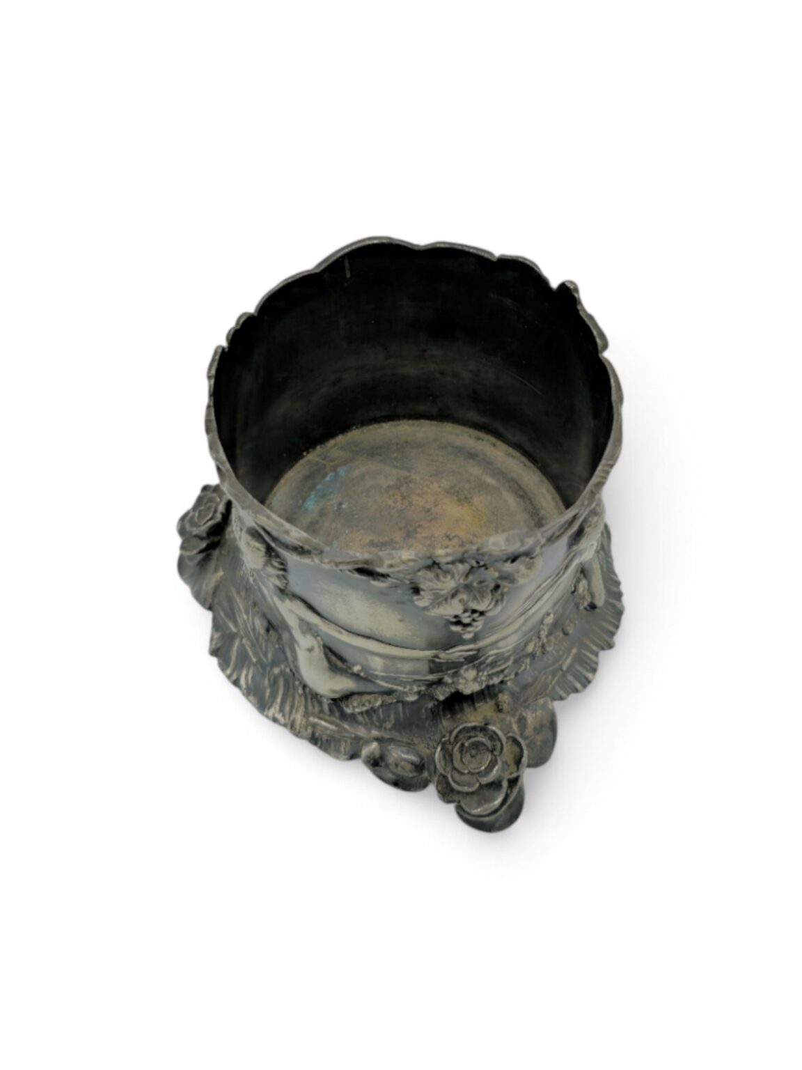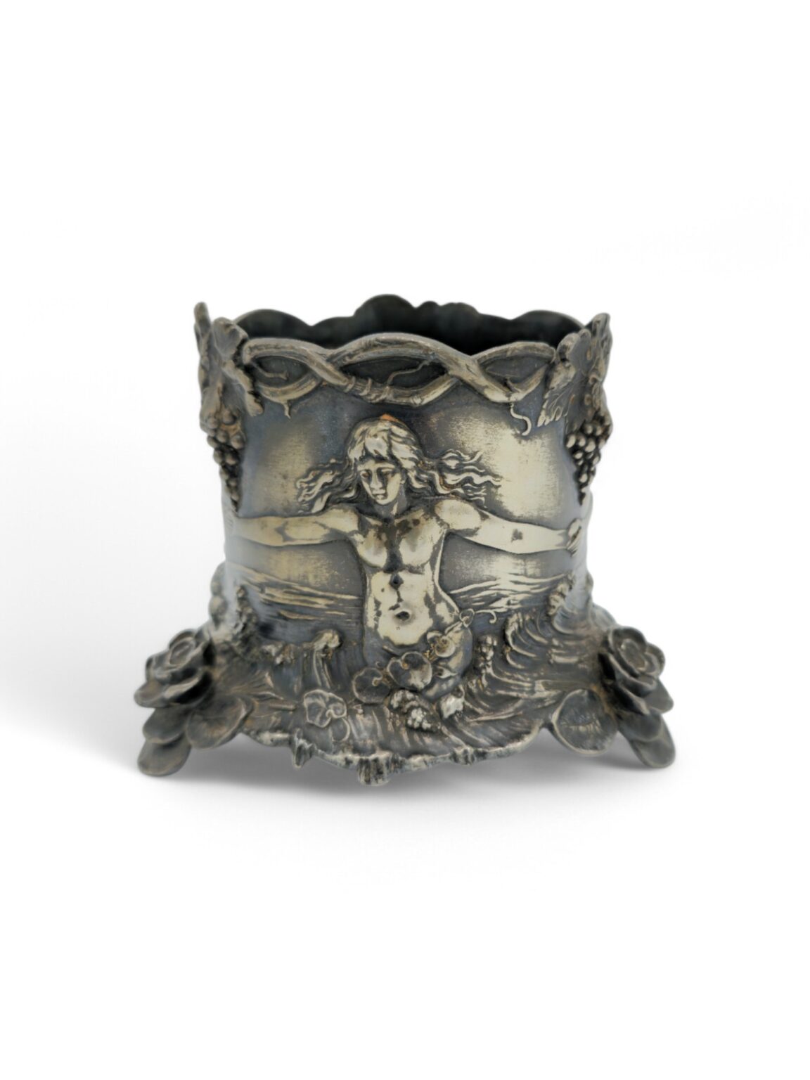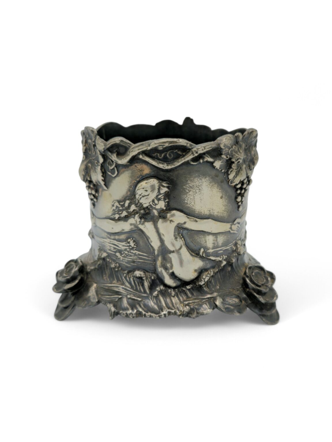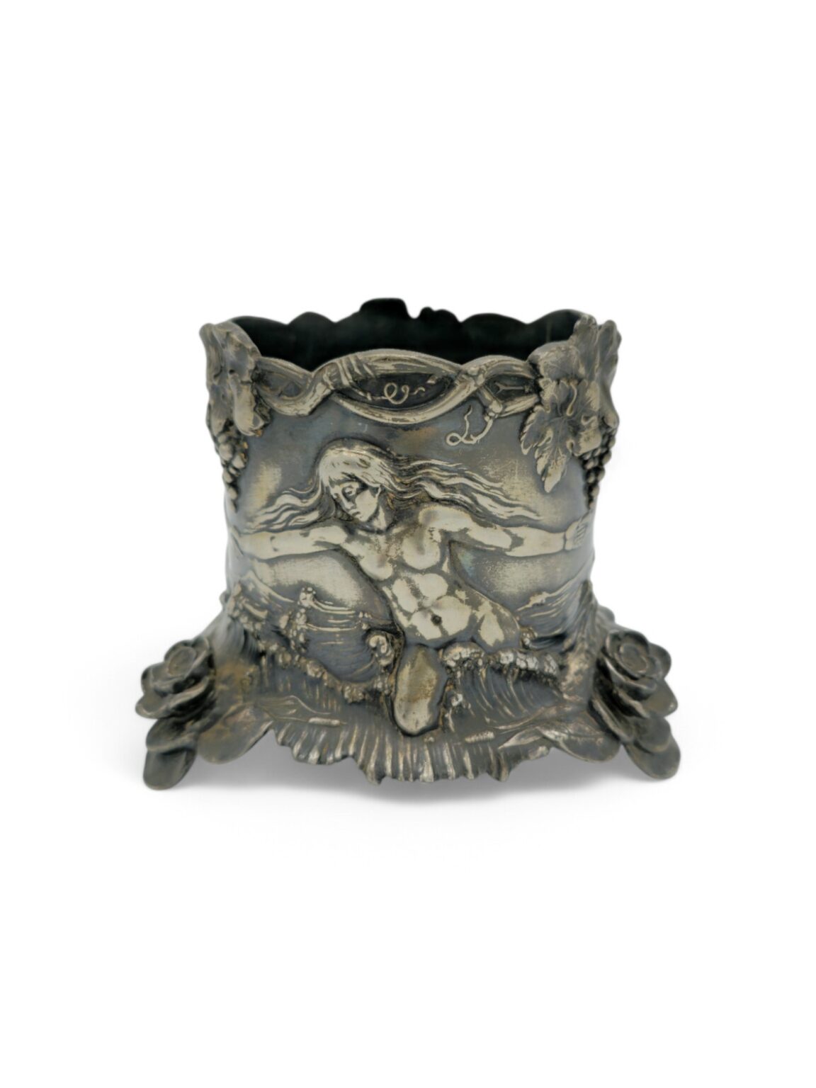 WMF, Porte-bouteille de style art nouveau orné de figures en bas-reliefs représentant trois personnages nus, se tenant les mains, dans un décor marin. La scène est surmontée de grappes de raisins., Métal argenté, vers 1900, 11 x 13,5 cm, Poinconné B , WMF